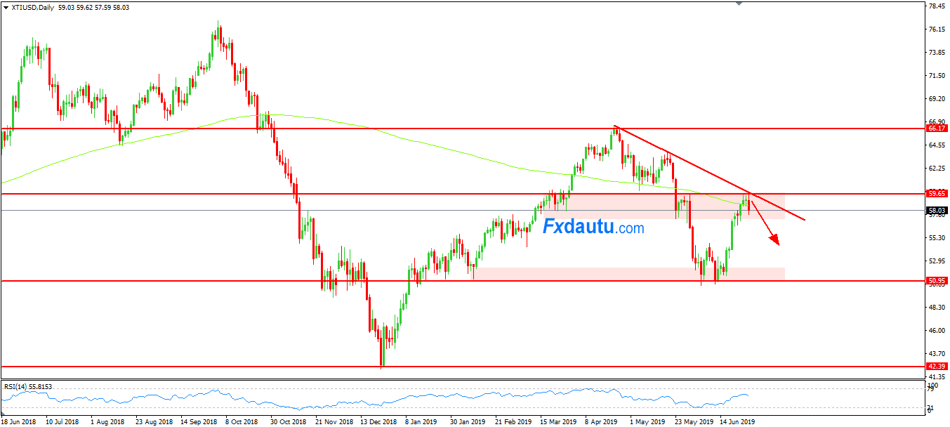 Giá dầu WTI tuần qua đã vào đến vùng chờ Short $58 – $59 của xu hướng giảm Downtrend kể từ tháng 4 đến nay.