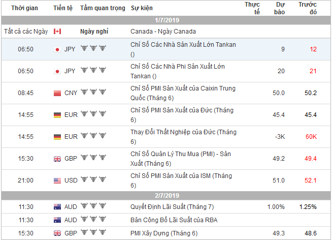 Một số tin tức đáng chú ý trong lịch kinh tế cho tuần tới 01/07-05/07: