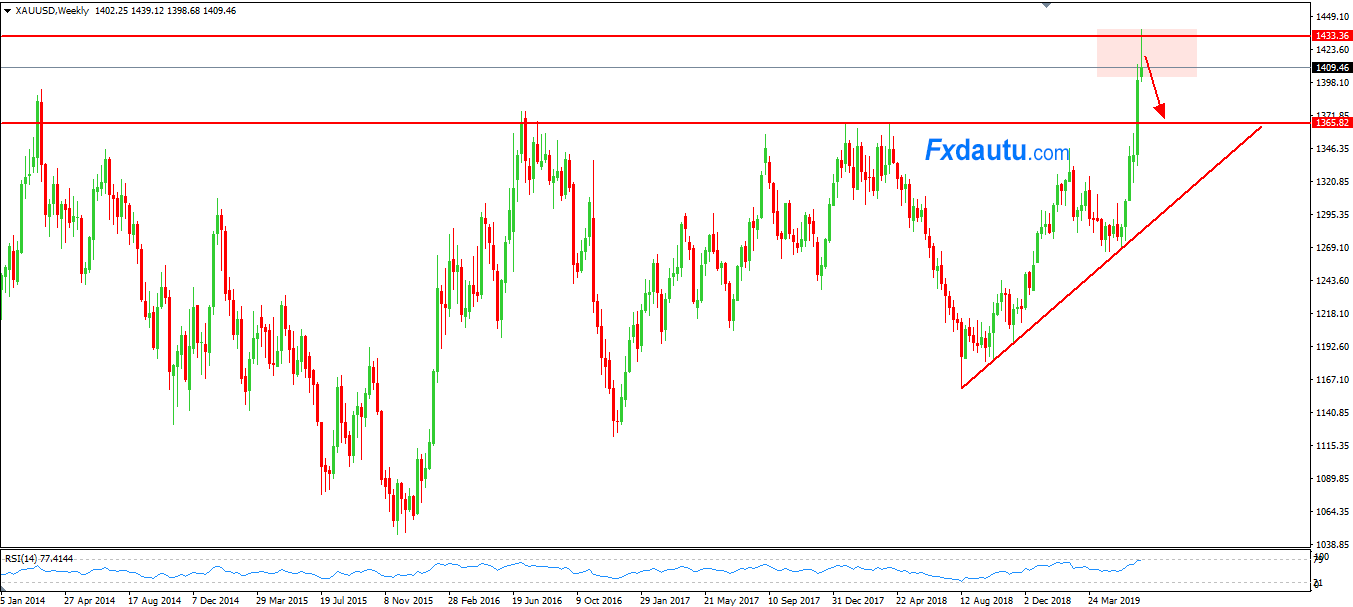 Giá vàng cao nhất trong tuần qua đạt được $1439.12/oz, tuy nhiên cuối tuần đã giảm lại khá mạnh và đóng cửa tại $1409.46/oz.