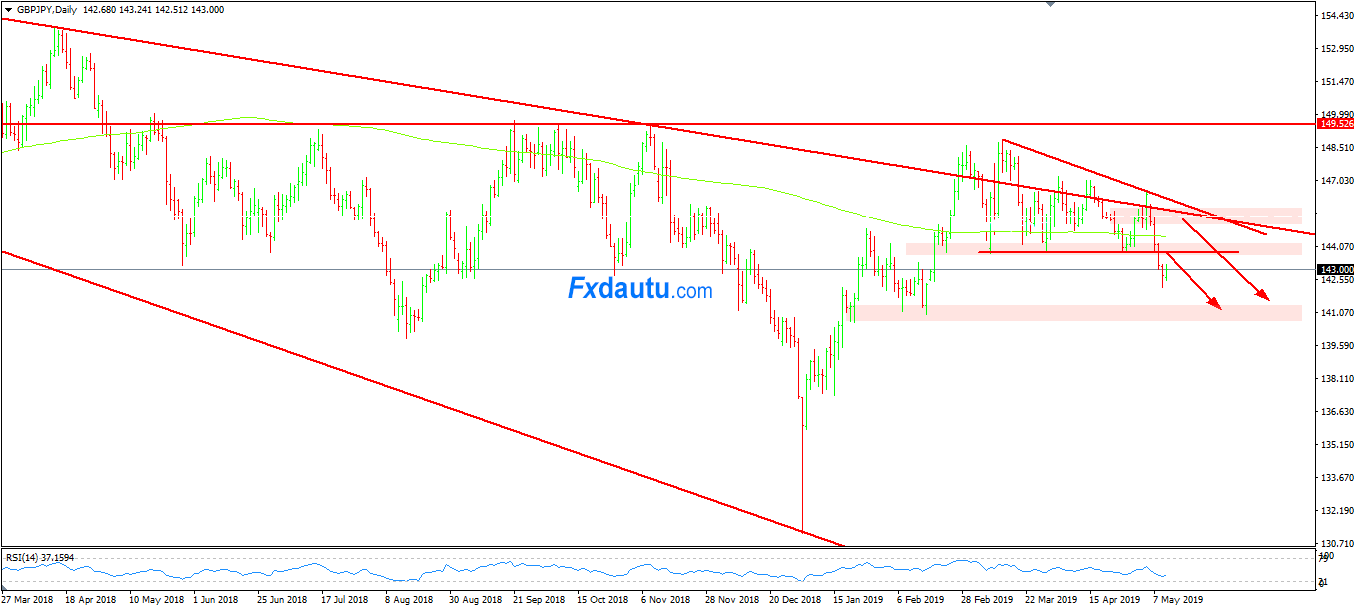 mô-hình-giá-GBPJPYGBP/JPY tuần vừa qua đã giảm rất mạnh và Breakout Key Support Level 143.80.