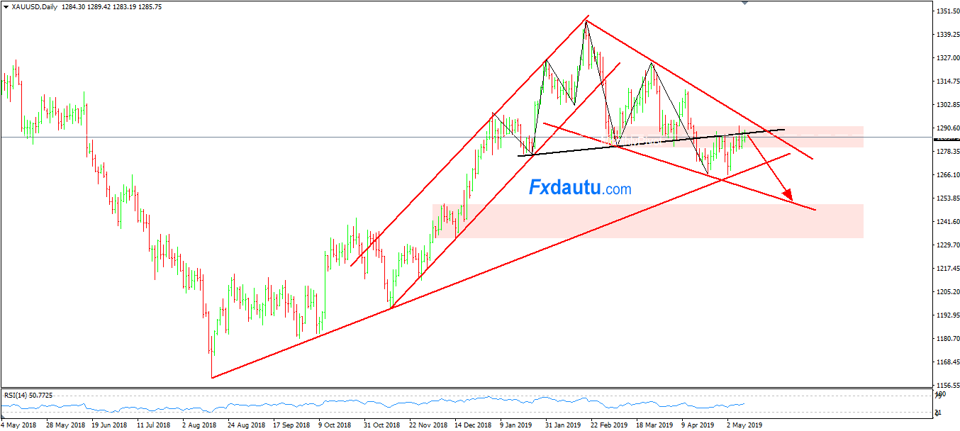 Nhưng hiện tại với giá Vàng đang nằm trong vùng 1285, vùng Resistance của mô hình giá Faliing Wedge (Nêm giảm) trung hạn của 3 tháng vừa qua.