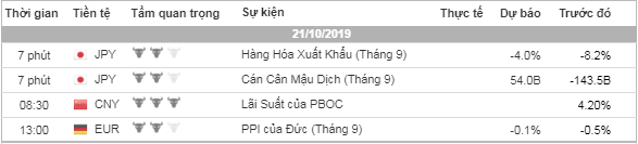 Các sự kiện kinh tế hôm nay trên thị trường tiền tệ không có nhiều điểm đặc biệt chú ý, chỉ mỗi PBOC công bố lãi suất ảnh hưởng đến đồng Nhân dân tệ. Cùng phân tích một số chiến lược giao dịch forex đáng chú ý hôm nay 21/10/2019.