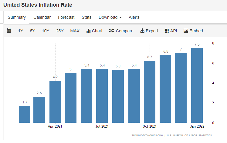 + Tỷ lệ lạm phát hôm qua công bố ở mức 7.5%, cao hơn dự đoán 7.1% và cao nhất trong vòng 40 năm kể từ 1982 (hình dưới).
