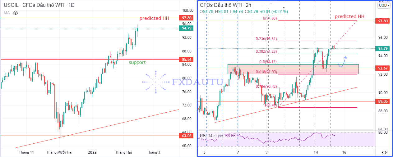 + Về mặt kỹ thuật dầu đang trong một xu hướng tăng với các vùng hỗ trợ đáng chú ý như 92.5 và 89.5