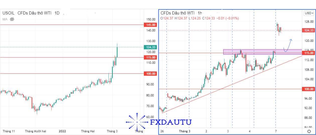 + Dầu WTI đã tăng lên mức kỷ lục khi mở cửa phiên sáng thứ 2 với Gap Up $6/thùng, đỉnh điểm sáng nay tăng lên $125/thùng khi EU có thể cấm dầu và khí tự nhiên của Nga, hiện 66% lượng dầu của Nga đang gặp khó khăn trong việc tìm kiếm người mua, theo JPMorgan.