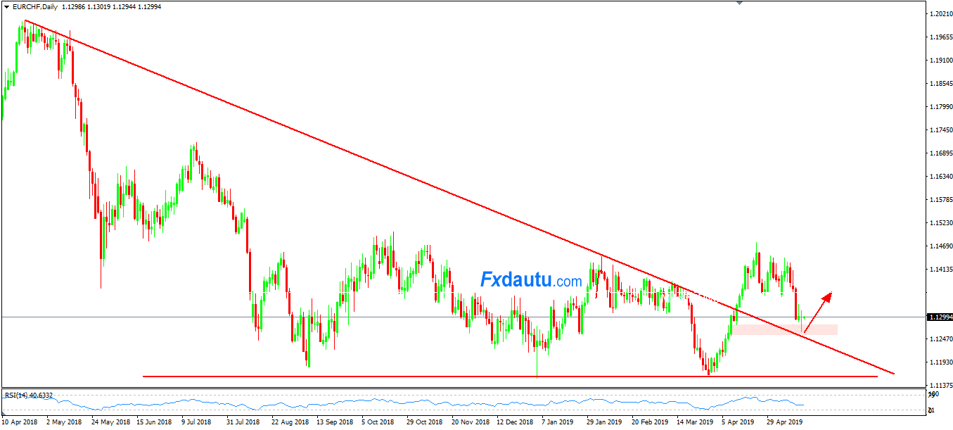 Sau khi Breakout Down Trendline dài hạn hơn 1 năm qua từ tháng 04/2018 vào giữa tháng 4 vừa qua, tỷ giá EUR/CHF đã có giai đoạn Pullback kéo dài từ đó đến nay.