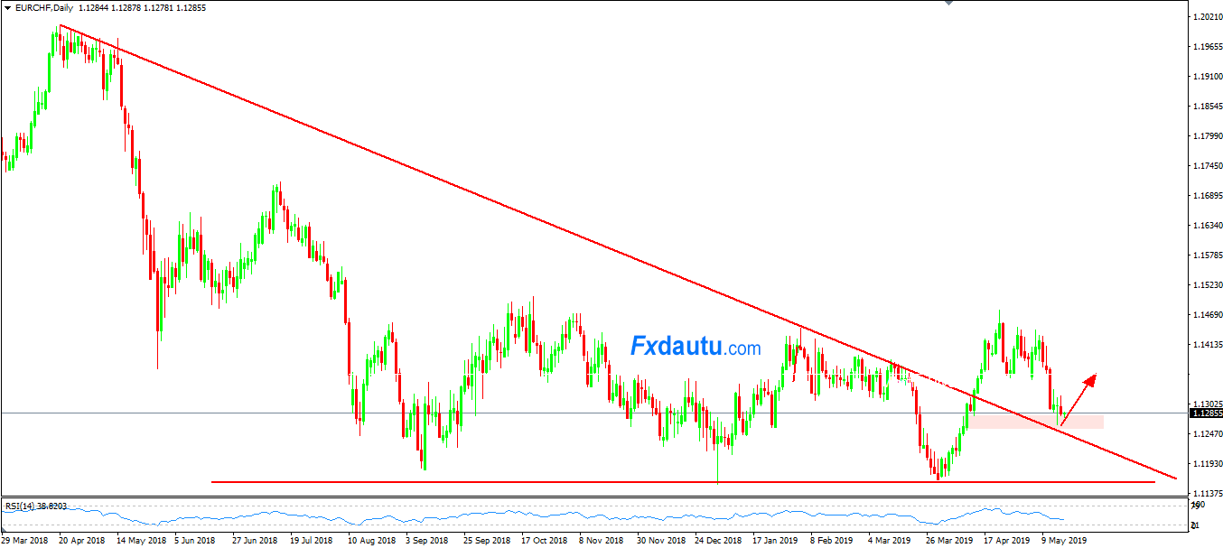 Với việc Breakout Down Trendline dài hạn hơn 1 năm qua từ tháng 04/2018 vào giữa tháng 4 vừa qua, tỷ giá EUR/CHF đã có giai đoạn Pullback đến nay.