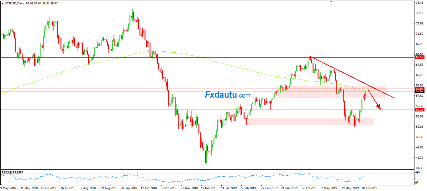 Và với phiên tăng giá hôm qua thì giá dầu WTI đã vào vùng Short của với Resistance Area $59 của Downtrend này.