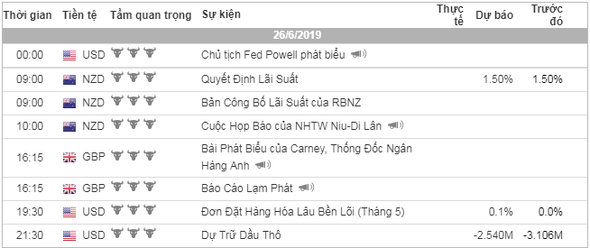 Sáng nay vào lúc 9:00 giờ Việt Nam, RBNZ sẽ công bố lãi suất, dự kiến ảnh hưởng mạnh đến đồng Kiwi. Cùng với dự trữ dầu thô của Mỹ tối nay sẽ dự kiến ảnh hưởng đến giá dầu thô. Cùng điểm qua một số chiến lược giao dịch đáng chú ý hôm nay 26-06-2019.