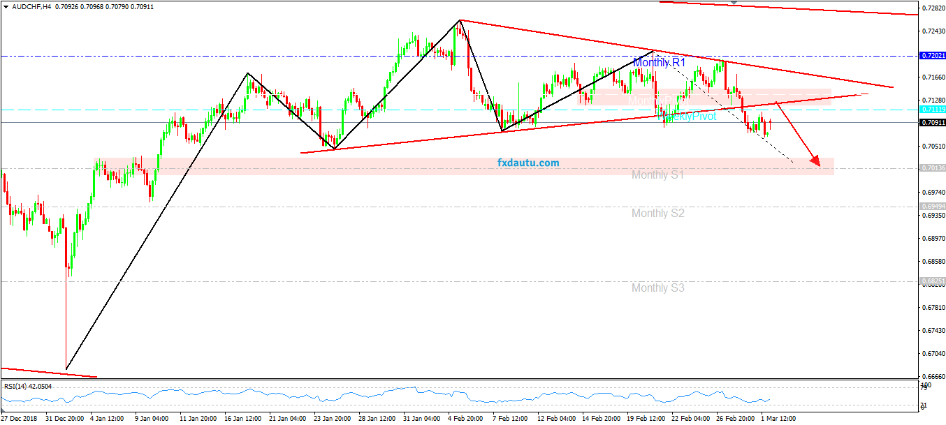 Chiến lược dành cho cặp ngoại hối AUD/CHF hôm nay sẽ là chờ giá Pullback về vùng 0.7110-0.7130 và Short theo Breakout mô hình giá Tam giác cân (Symmetrical Triangle) và theo dự đoán mô hình giá Vai-Đầu-Vai (Head and Shoulders).