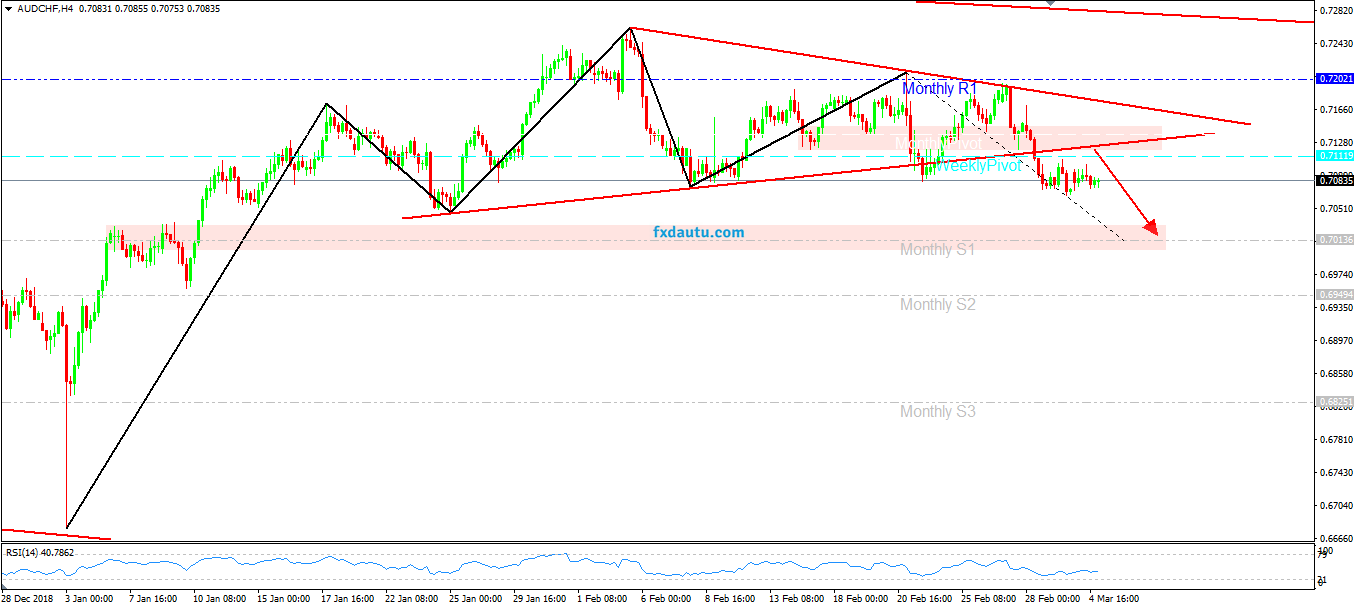 Chiến lược dành cho cặp ngoại hối AUD/CHF hôm nay sẽ Short quanh vùng giá 0.7100-0.7120 theo Breakout mô hình giá Tam giác cân (Symmetrical Triangle) và theo dự đoán mô hình giá Vai-Đầu-Vai (Head and Shoulders).
