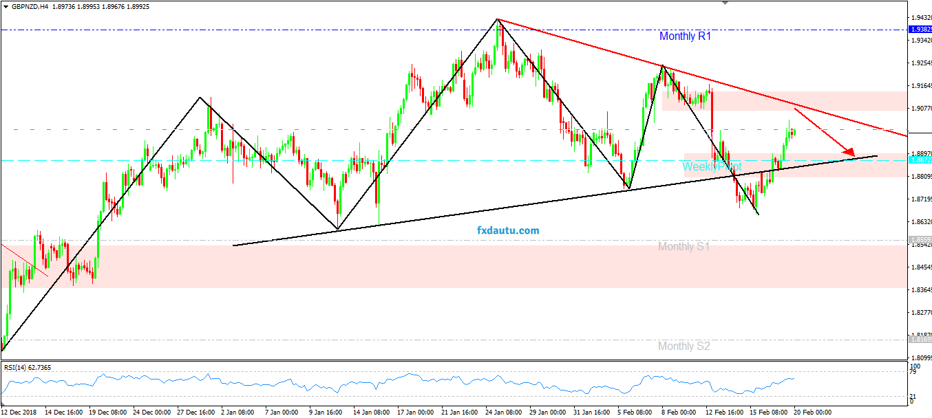 Hiện tại giá vẫn đang trong quá trình Pullback sau khi đã Breakout neckline (đường cổ) của mô hình Head and Shoulders này khi đóng cửa dưới với 1.8718 tại phiên giao dịch 14/02 vừa qua. Tuy hiện giá đang Pullback khá mạnh nhưng xu hướng giảm ngắn hạn từ cuối tháng 01/2019 vẫn không thay đổi.
