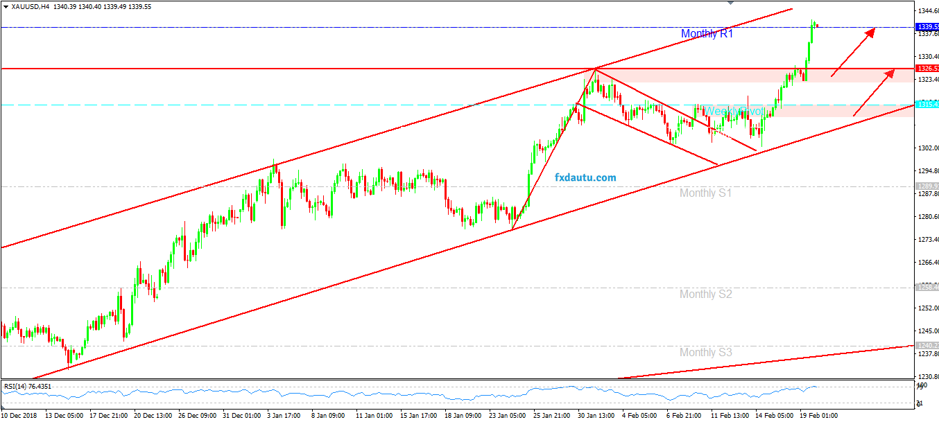 Xu hướng tăng trung hạn và dài hạn của Vàng vẫn không có gì thay đổi, việc giá Vàng tiếp tục tăng là điều nằm trong dự đoán, nhưng với phiên giao dịch của Vàng hôm qua tăng rất mạnh, rất ấn tượng đã làm không ít nhà đầu tư bối rối khi tăng hơn $15 từ 1326.15 đến 1341.06. Qua đó Breakout đỉnh cũ 1325.57 được xác lập vào cuối tháng 01/2019 vừa qua.