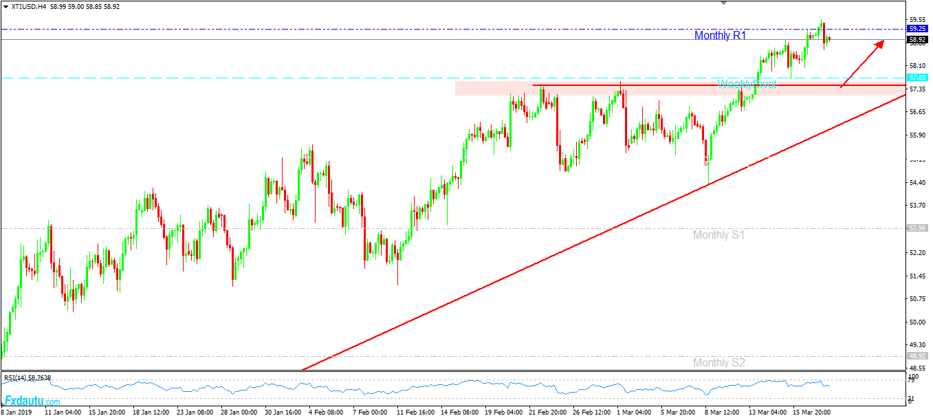 Tại phiên giao dịch hôm qua dầu WTI cũng có dấu hiệu chững lại quanh vùng giá này bằng một nến Doji khung Daily, liệu đây có phải là giai đoạn dầu WTI sẽ Pullback sau khi Breakout Key Resistance Level vùng giá 57.5 tại phiên giao dịch 13/3 vừa qua.