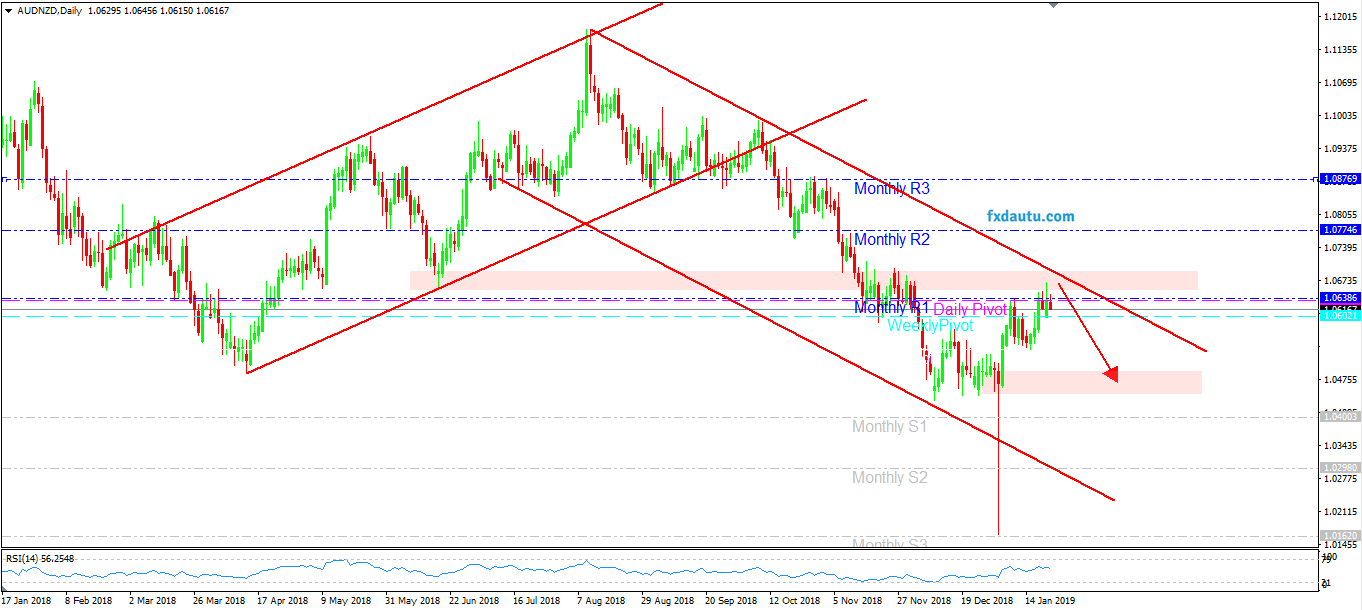 Hôm qua AUDNZD có một phiên bật mạnh với giá cao nhất đạt được là 1.0670 ngay tại vùng Kháng cự (Resistance), tuy nhiên cuối phiên giá đã từ chối lên tiếp và đã giảm xuống cũng ngày tại vùng Resistance này.