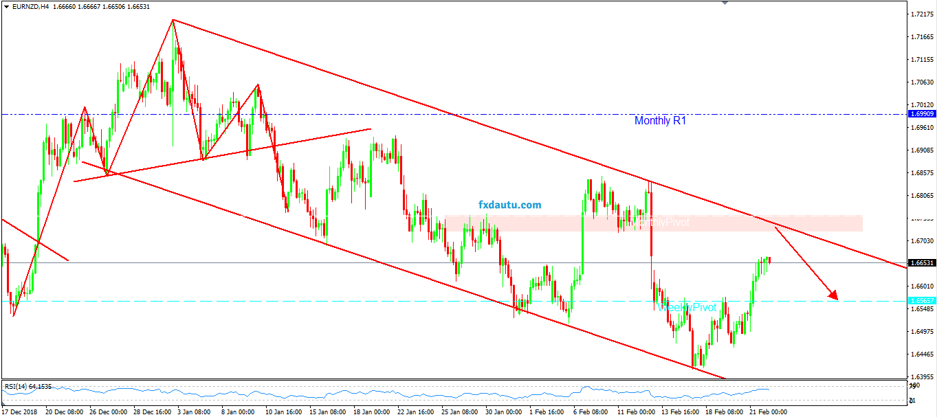 Và EUR/NZD hiện đang trong xu hướng giảm Downtrend kể từ tháng 12/2018. Nhưng phiên tăng gần đây đã đưa giá EUR/NZD gần đến vùng chờ Bán 1.6730-1.6750, cũng là vùng Resistance của Trendline giảm.