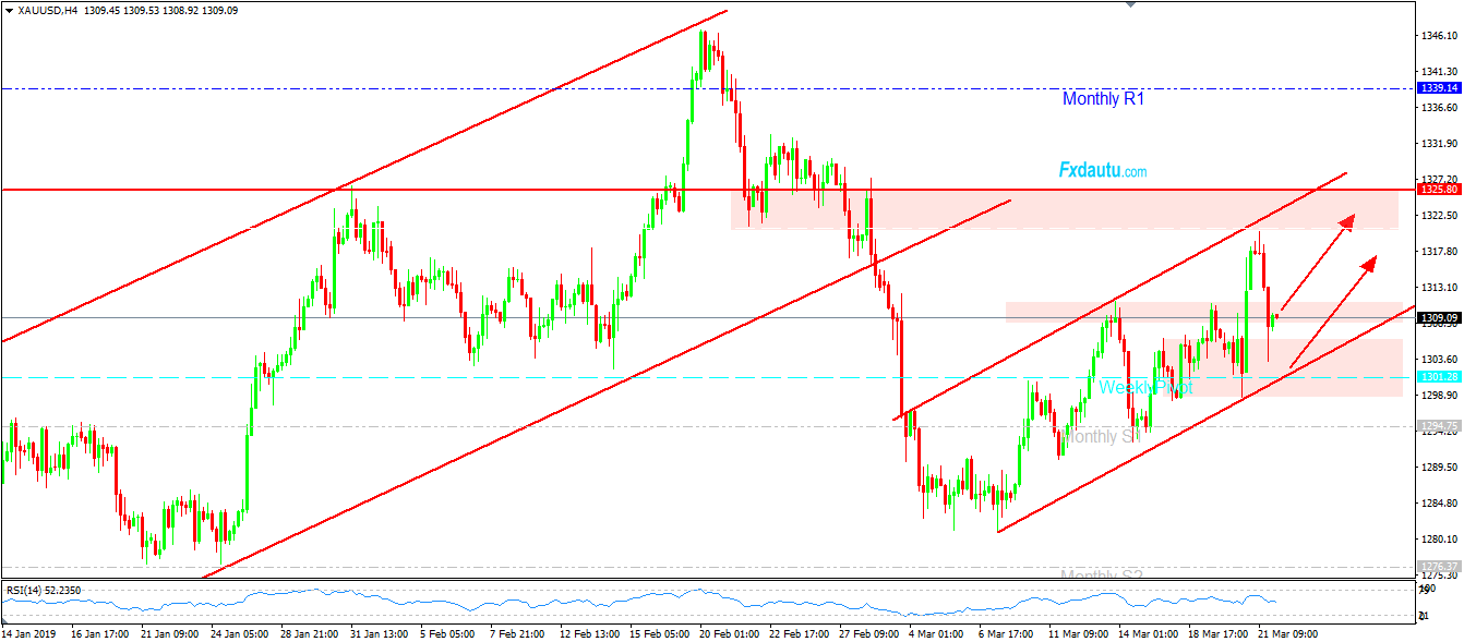 Với việc giá Vàng chính thức Breakout Resistance Level 1311 cách đây 2 ngày, qua đó hình thành xu hướng tăng Uptrend ngắn hạn kéo dài từ đầu tháng 3/2019.