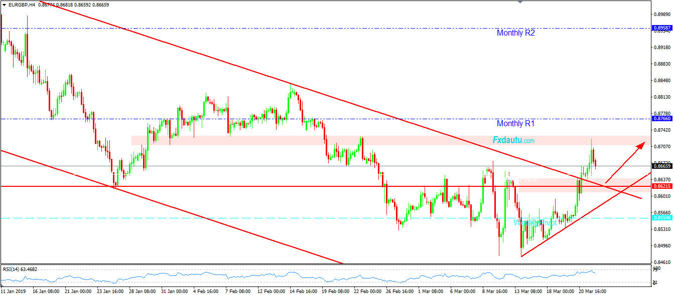Với việc tăng như vậy thì EUR/GBP đã chính thức Breakout Trendline giảm trung hạn hơn 3 tháng qua kể từ đầu tháng 1/2019, đồng thời cũng Breakout cả Resistance Level 0.8675, qua đó bắt đầu một xu hướng tăng sắp hình thành.