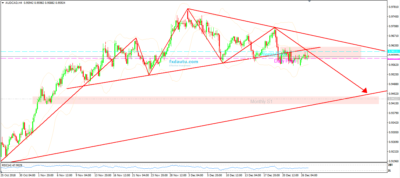 Chiến lược cho AUDCAD hôm nay vẫn là short tại vùng giá đường cổ (neckline) của mô hình Head and Shoulders 0.9580 và theo xu hướng downtrend.