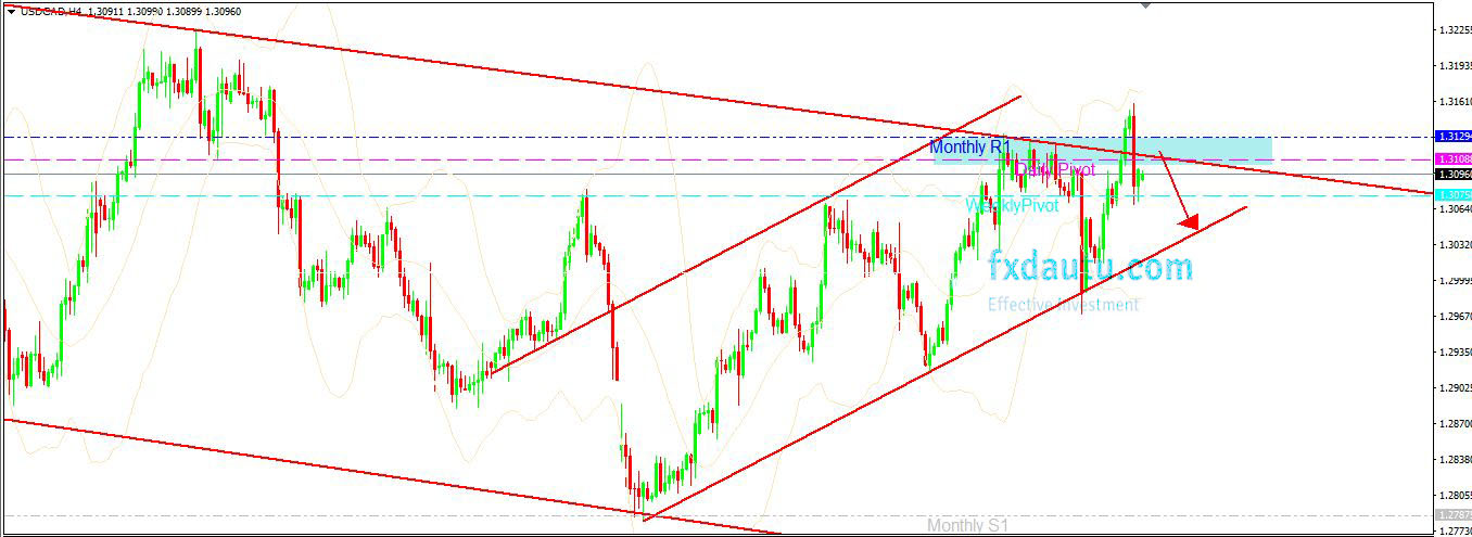 Tương tự USDCAD, cặp AUDCAD cũng canh giá lên tạo mô hình 2 đỉnh H4 ngắn hạn và sell theo xu hướng giảm, Stop loss trên đỉnh H4 của vùng đã vẽ.