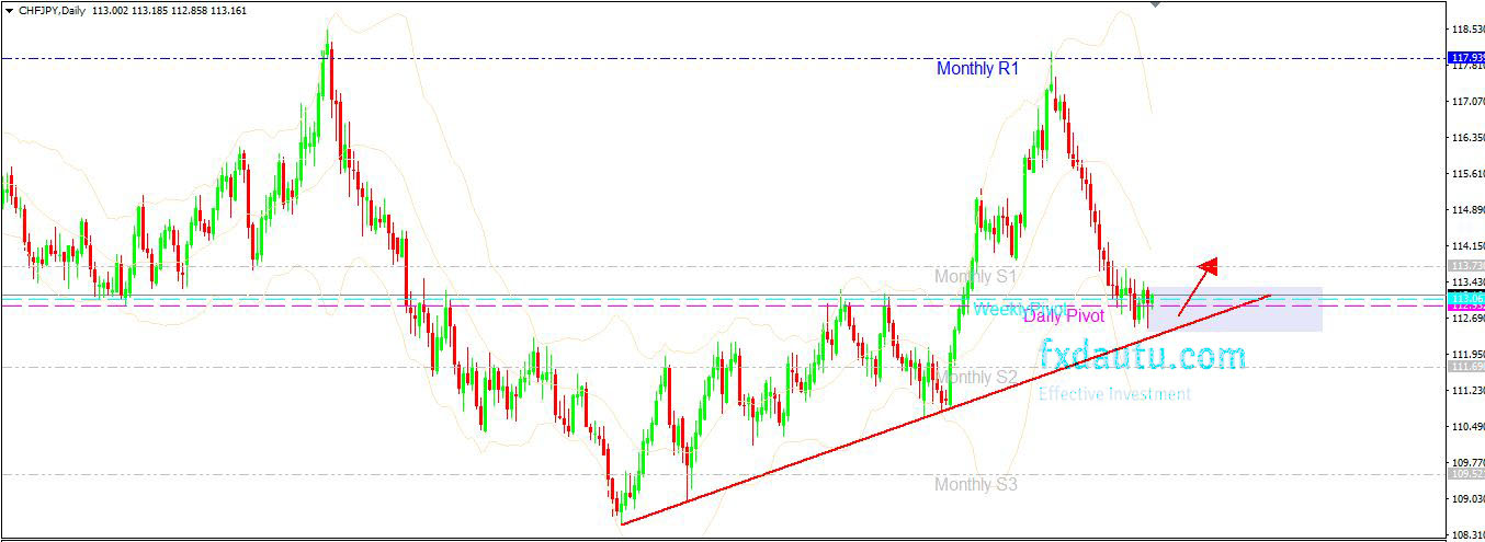 XU hướng tăng uptrend của khung D1 + 1 nến pinbar ngày hôm qua ngay tại vùng support mạnh là tiền đề để hôm nay chúng ta canh buy, giá này mình có thể vào buy trực tiếp được cho kèo CHFJPY.