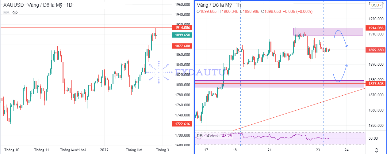 + Kết thúc phiên vàng đã giảm 100 pips từ 1908 xuống 1898. Như vậy vàng từ chối phá vỡ vùng kháng cự 1917 cũng là đỉnh cũ của mình cao nhất trong vòng 8 tháng qua kể từ tháng 6/2021.