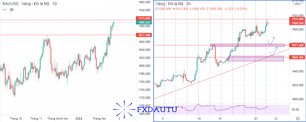+ Như vậy vàng tiếp tục lập đỉnh mới của mình trong vòng 8 tháng qua kể từ tháng 6/2021 và đang thách thức mức cao này ở vùng 1915.