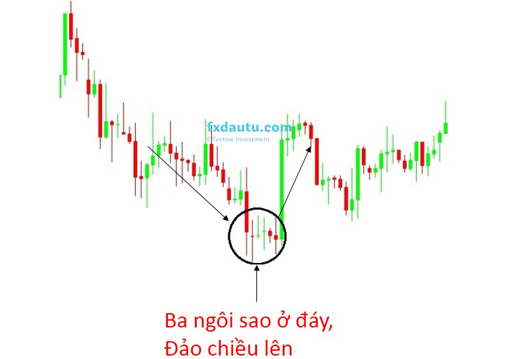 Một mô hình nến đảo chiều mạnh mẽ nữa mà các trader cần nằm lòng chính là mô hình nến 3 ngôi sao.