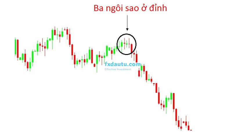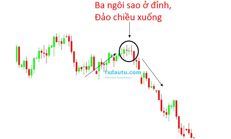 Ngược lại, nến ba ngôi sao xuất hiện tại đỉnh báo hiệu giá có xu hướng đảo chiều xuống.