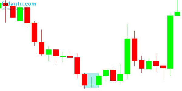 Đôi khi nến Bullish Harami phía sau cây nến đỏ giảm mạnh cũng có thể là cây nến Doji.