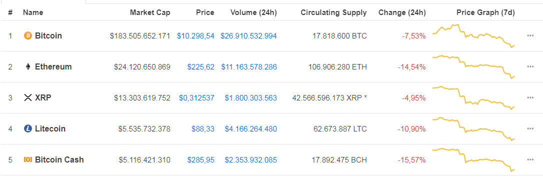 Bitcoin giảm xuống gần mức 10.000 USD vào thứ Hai ở châu Á sau những bình luận tiêu cực của Tổng thống Hoa Kỳ Donald Trump vào cuối tuần trước.