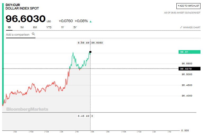 Chỉ số USD Index, chỉ số đo sức mạnh của đồng bạc xanh so với rổ sáu loại tiền tệ chính, ở mức 96,51 lúc 3:45 AM ET (08:45 GMT), mức tốt nhất kể từ ngày 22 tháng 2.
