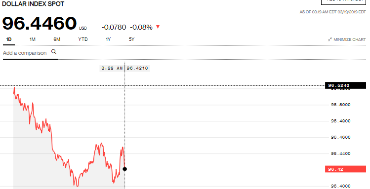 Chỉ số này đã mất 1.3% sau khi đạt mức cao nhất 97.71 vào ngày 7/3, mức cao nhất trong 3 tháng, theo các quan điểm có thể FED sẽ đưa ra một giọng điệu ôn hòa tại của họp kéo dài 2 ngày của mình được bắt đầu sau thứ 3.